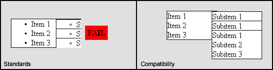 The list element has child list elements which appear fly-out-menu style to the right and downwards. The clip value above should allow these menus to appear up to 1000px beyond the right and bottom borders of the parent box. Below is what we see in IE8 SP2 when in standards mode (left) and compatibility mode (right):